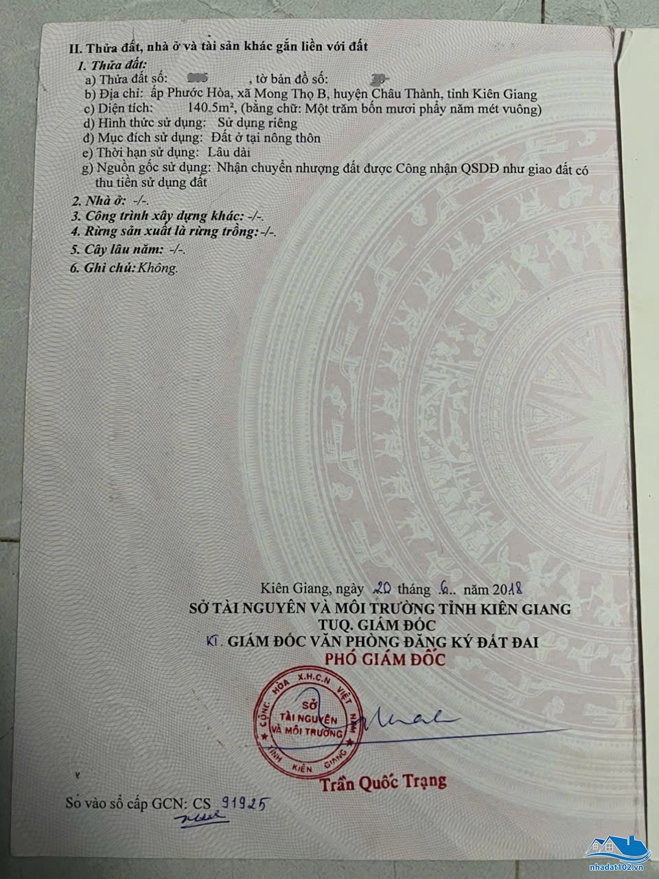Bán biệt thự và đất đường lộ nhựa Giục Tượng (ấp Phước Hòa, xã Mong Thọ B, Châu Thành, Kiên Giang)