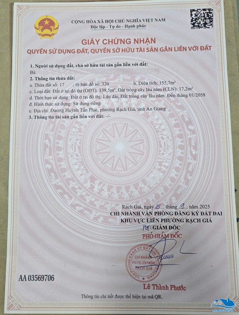 Bán đất thổ cư 6,9x20 mặt tiền đường Huỳnh Tấn Phát (phường Vĩnh Hiệp cũ - phường Rạch Giá, An Giang)