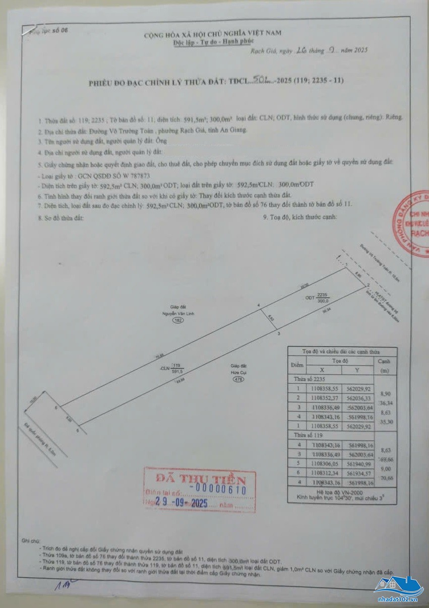 Diện tích: 891m² Ngang: 8.9m Dài: 106m Hướng: Đông Bắc